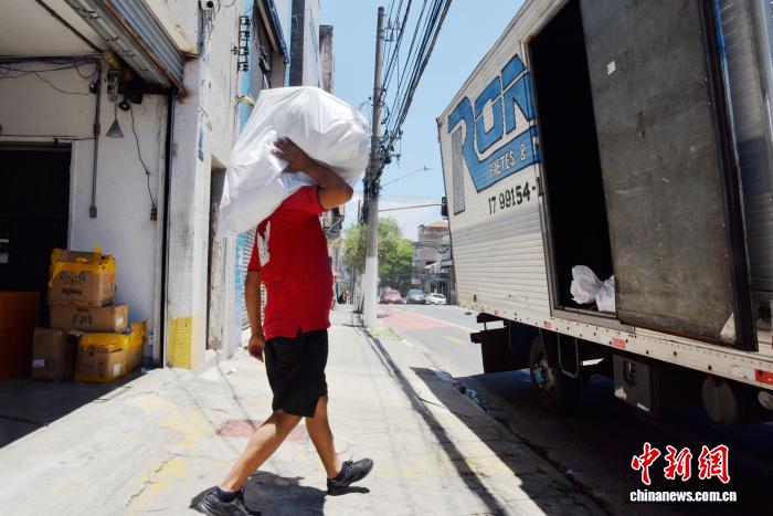 当地时间12月27日,巴西圣保罗发布红色高温预警,一位物流公司员工在布拉斯商区将宠物清凉用品搬上卡车。中新社记者林春茵摄